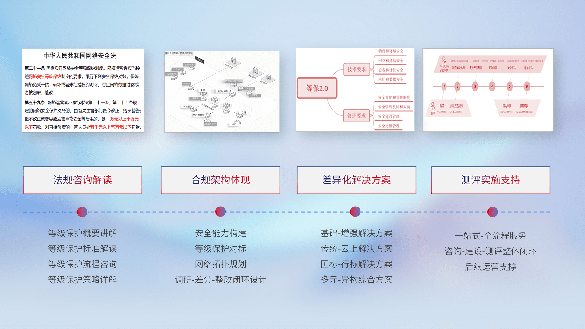通过专业的法律咨询解读、、、合规架构体现、、差异化解决方案、、、、测试实施支持等服务,,为客户量身打造等保合规体系。。。